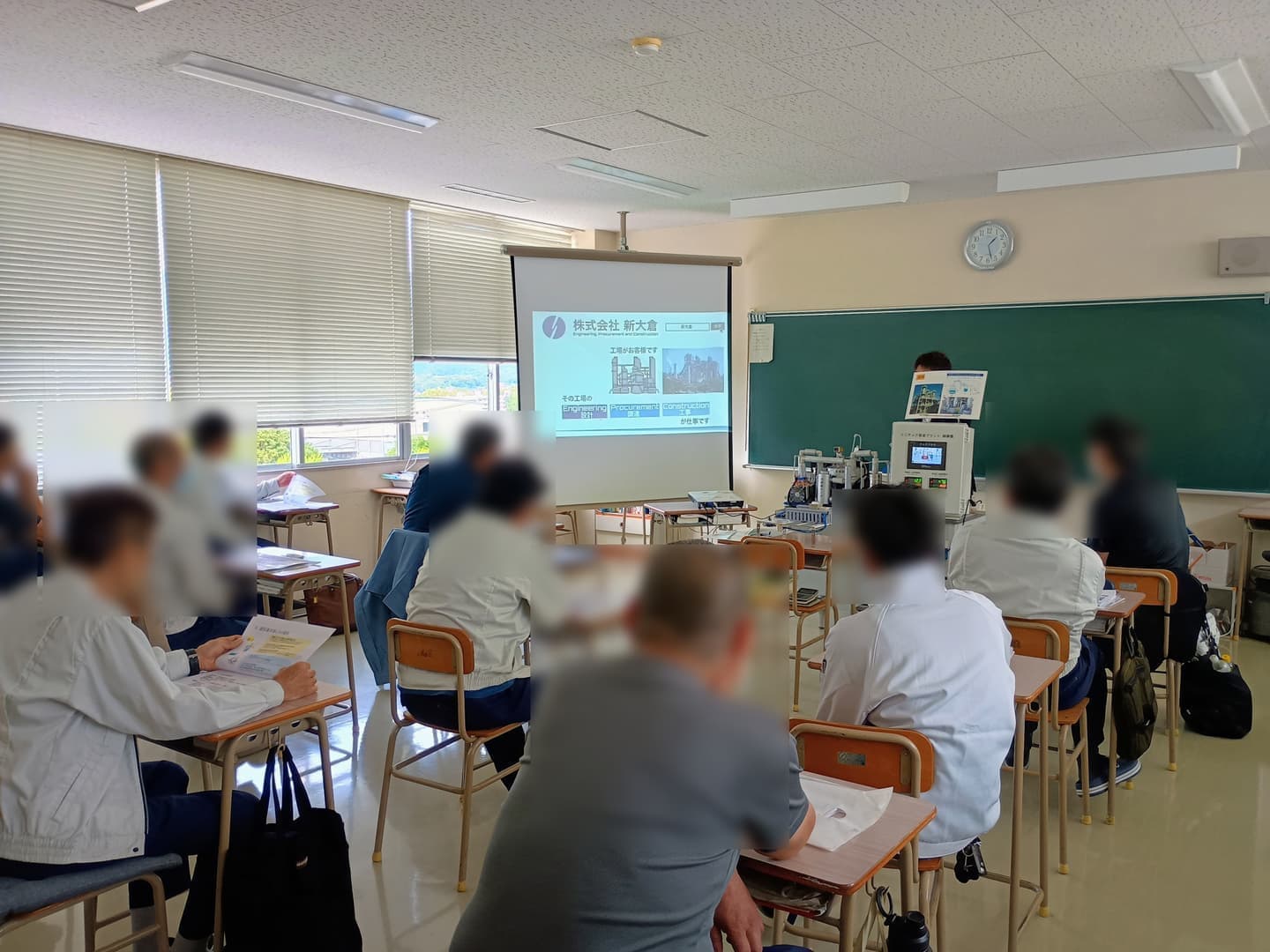 職業訓練では、電気工事の技能や知識がメインに行われており、就職先もプラント工事に関わる業種が多く、プラントの概要、プラント工事の業態・商流を中心に講義を行いました。