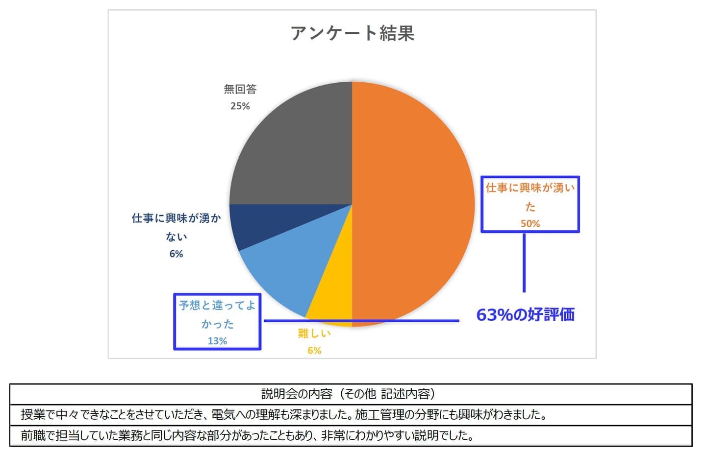アンケート結果は良好にて、プラントでの電気計装工事や施工管理業に興味を持っていただけたと存じます。