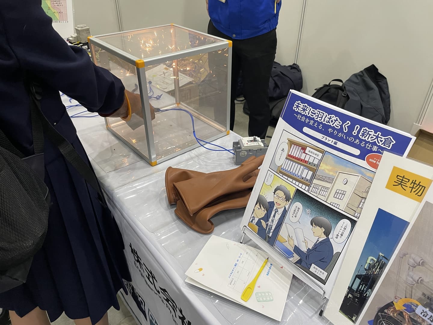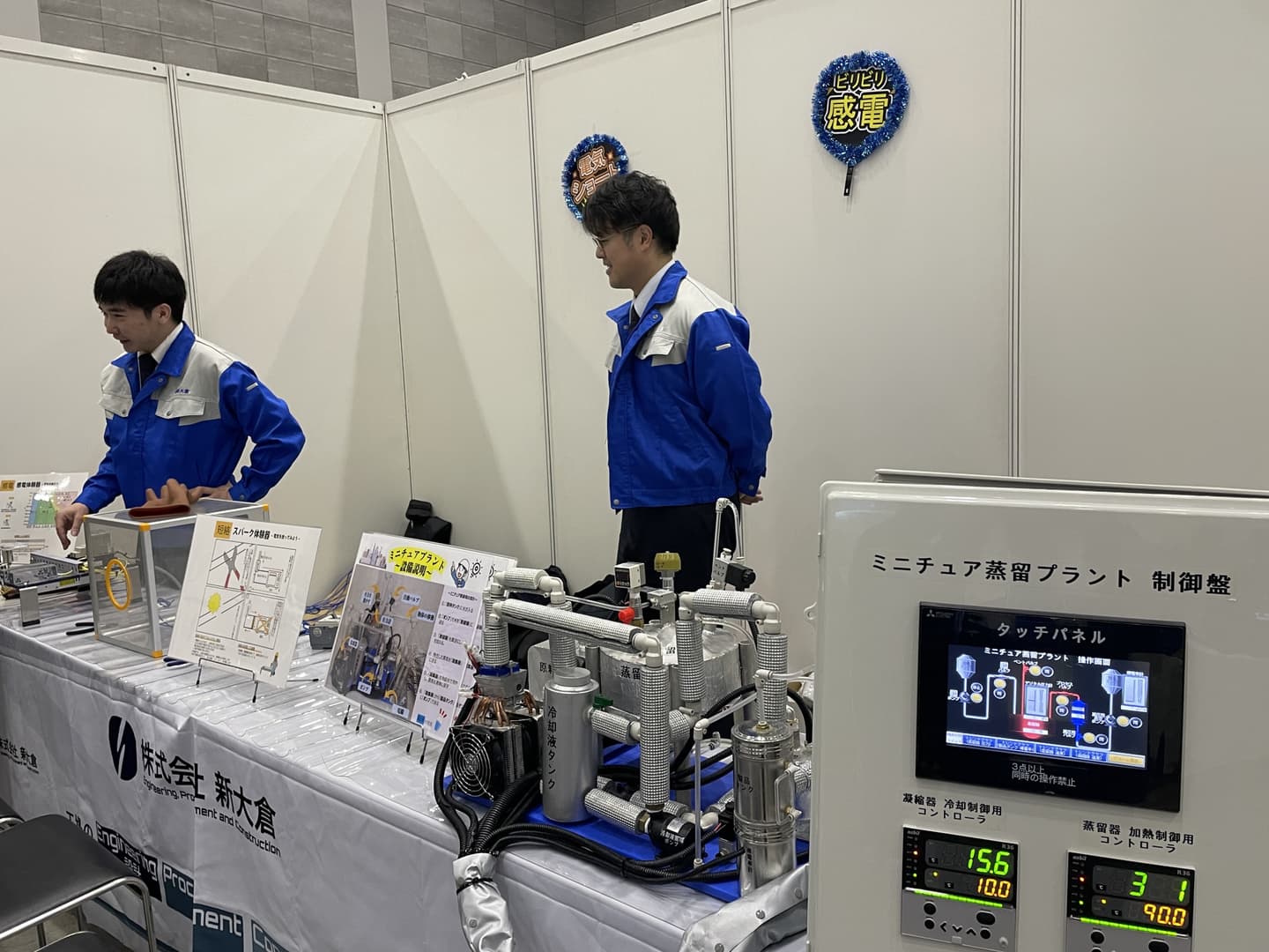 弊社ブースでは、感電体感装置、短絡体験、ミニチュア蒸留プラント、見積体験コーナーを出展内容としました。