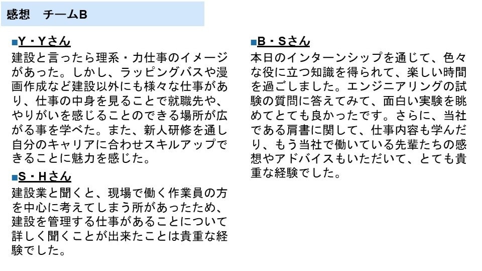 本インターンシップが、今後の進路選択における一助となれば幸いです。