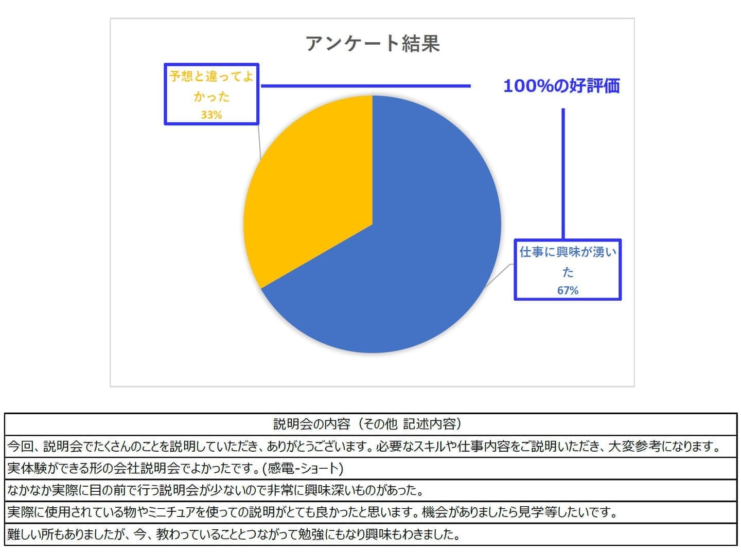 アンケート結果は良好にて、プラントでの電気計装工事や施工管理業に興味を持っていただけたと存じます。
